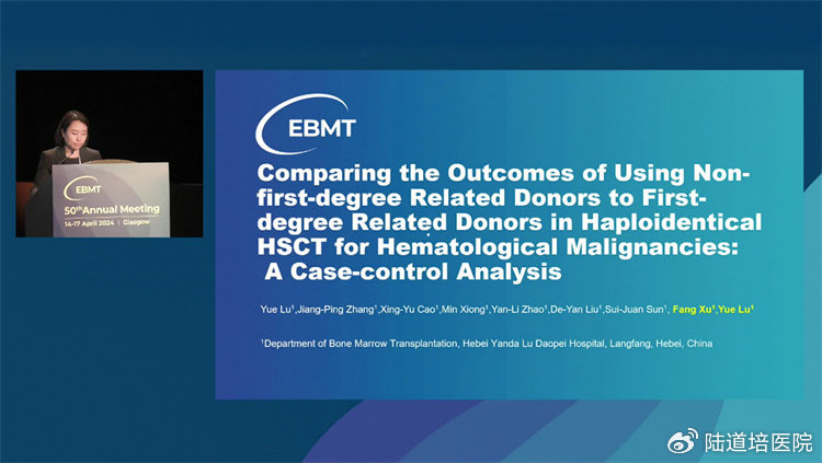 當(dāng)?shù)貢r間,4月16日下午15:15,由陸道培醫(yī)院骨髓移植科胥方醫(yī)生代表盧岳主任團(tuán)隊在“Optimising donor Choice”環(huán)節(jié)中,口頭匯報了“Comparing the Outcomes of Using Non-First-Degree Related Donors to First-Degree Related Donors in Haploidentical HSCT for Hematological Malignancies: A Case-Control Analysis”的臨床研究成果,研究證實了在單倍體造血干細(xì)胞移植中,采用非直系供體在療效及安全性方面均可以與直系供體相媲美,這也為臨床上擴展單倍體移植供者的可選擇范圍提供了進(jìn)一步的證據(jù)支持。盧岳主任團(tuán)隊這一項研究受到了頗多關(guān)注。
