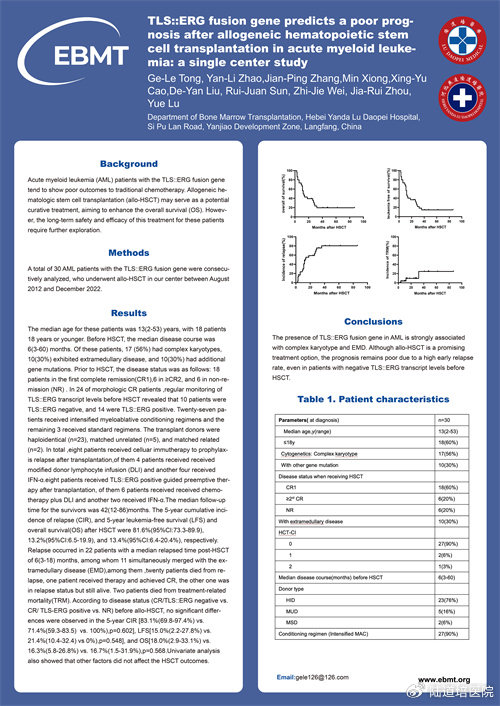 題目:TLS∷ERG Fusion Gene Predicts A Poor Prognosis after Allogeneic Hematopoietic Stem Cell Transplantation in Acute Myeloid Leukemia: A Single Center Study