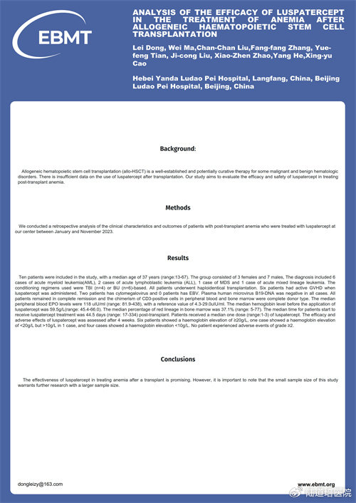 題目:Analysis of the Efficacy of Luspatercept in the Treatment of Anemia after Allogeneic Haematopoietic Stem Cell Transplantation