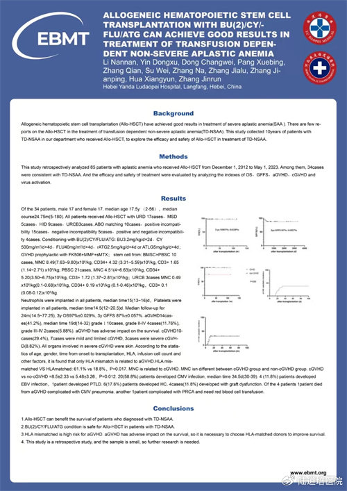 題目:Allogeneic Hematopoietic Stem Cell Transplantation with Bu(2)/Cy/Flu/ATG can Achieve Good Results in Treatment of Transfusion Dependent Non-Severe Aplastic Anemia