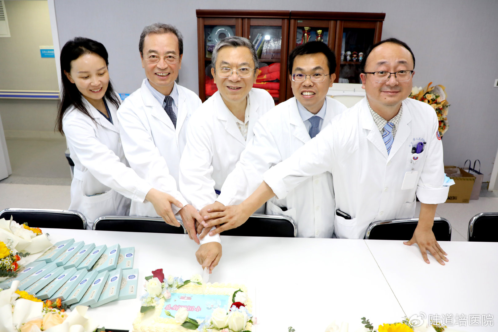 8月16日,中國工程院院士、北京大學(xué)血液病研究所所長黃曉軍院士、北京陸道培血液病醫(yī)院醫(yī)療常務(wù)副院長王景文教授、聯(lián)合病房孫于謙主任等醫(yī)師團隊,在病例談?wù)?、大查房結(jié)束之后,在血液二病區(qū)會議室進行了簡單的慶祝,并以切蛋糕的方式共度節(jié)日。